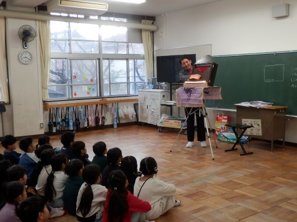 下学年の朝の読み聞かせがありました。昨日のお話会に引き続き「おむすびころりん」の方々にお世話になります。