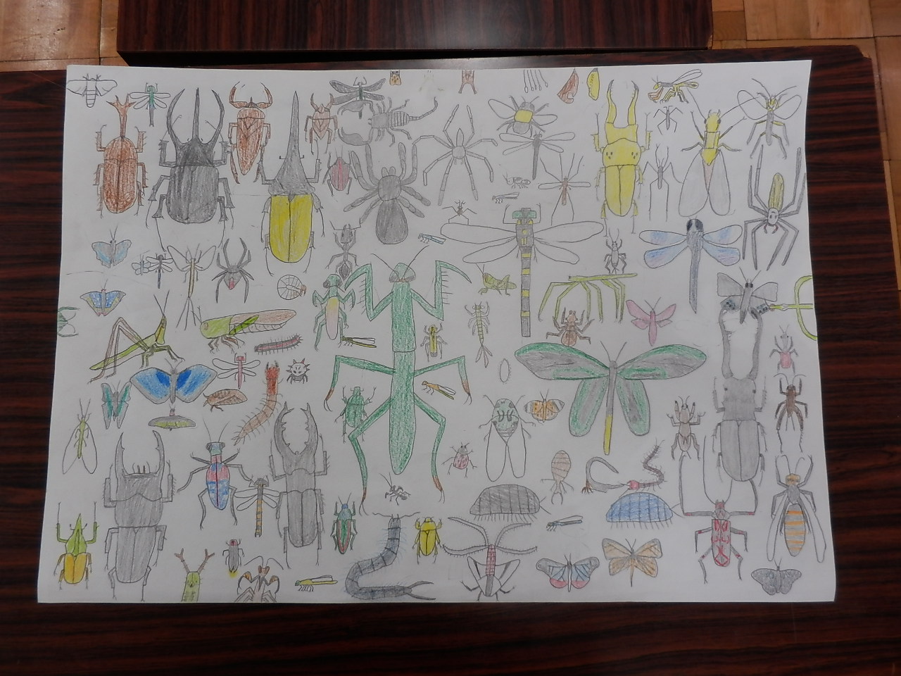 富士見っ子の中に昆虫が大好きで昆虫のことなら何でも知っているくらいのはかせのようなお友達がいます。今日は、「昆虫101匹絵にしてきたよ」と画用紙いっぱいの作品を見せてくれました。