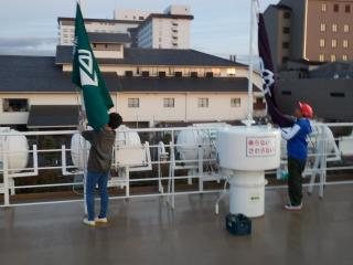 国旗、県旗、校旗を掲げて、朝の大津体操をしました。