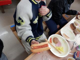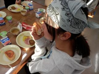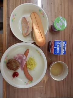2日目の朝食はセルフメイドサンドイッチです。自分でパンにウィンナーやハンバーグをはさみます。
