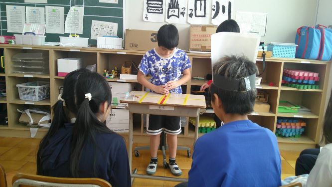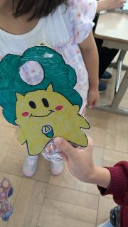 生活科の学習でおもちゃ作りをしていました。おもちゃの中に「フジッキー」が登場。