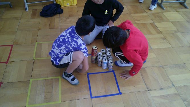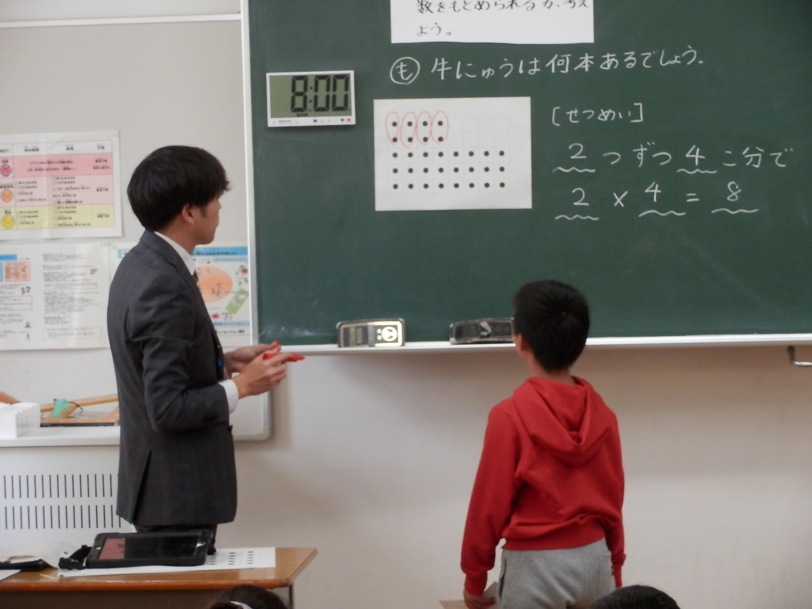 2年生はかけ算を使って牛乳の数を数える学習をしていました。かけ算の九九だけでは求められない数を(は)やく(か)んたん(せ)いかくに、の「はかせ」を目指して考えました。