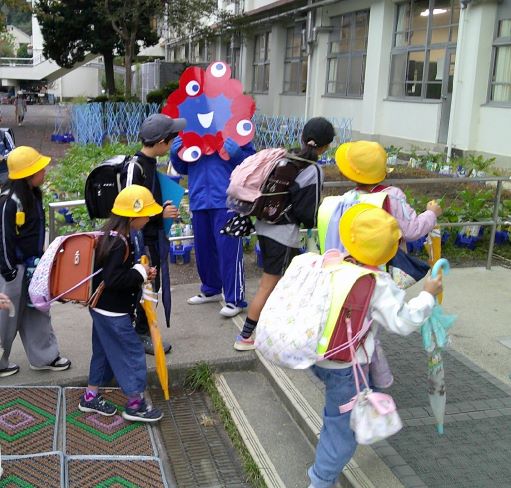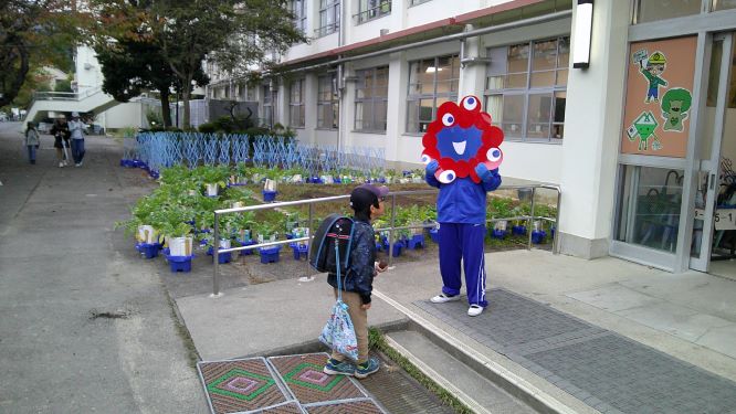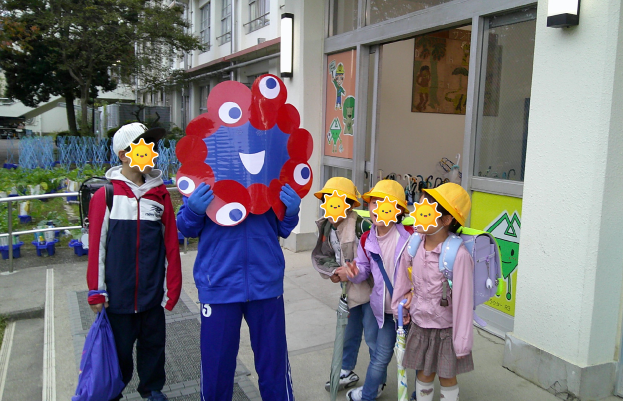 ハロウィンにちなんで朝のあいさつ運動に「ミャクミャク」がゲスト参加してくれました。6年生のお兄さんが「やってみたい!」と有志で仮装してくれました。