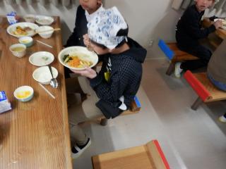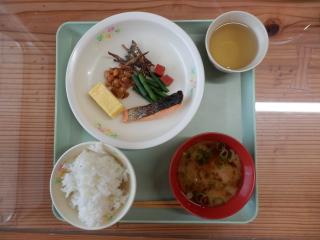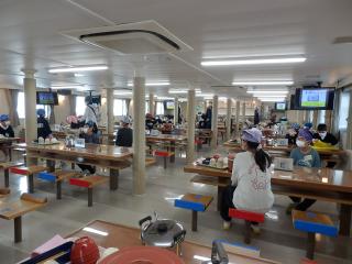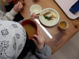 うみのこ初の食事は滋賀、びわ湖の特産品を使った献立です。ます、ワカサギ、えび豆、赤こんにゃく、しじみ汁などおいしかったです。