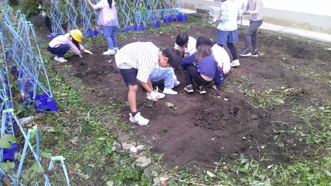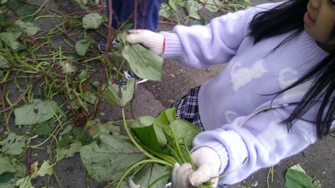 今年は芋の葉があまり大きくなくて、さつまいもができているかなあと心配していましたが、みんなで頑張って掘ってみると、大小合わせて60個ほどの芋が取れました。