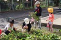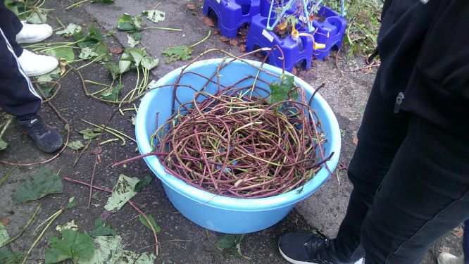 1年生が育てていたさつまいもを収穫した後、残ったつるを集めていました。「つるを集めてどうするの?」とたずねたら、「クリスマスリースを作るの。」と答えてくれました。