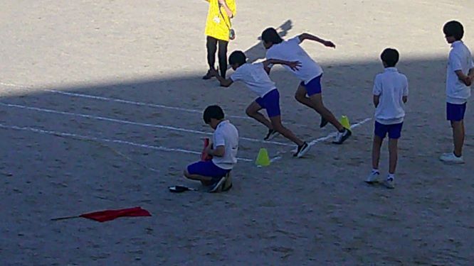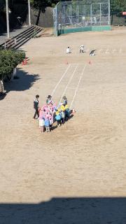隣の富士見幼稚園との交流の一環で、小学校の体育の得意な先生によるスポーツ教室がありました。4歳児・5歳児クラスの園児たちが小学校のグランドで50m走、ボール投げの練習をしました。