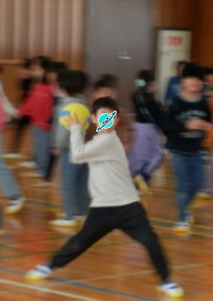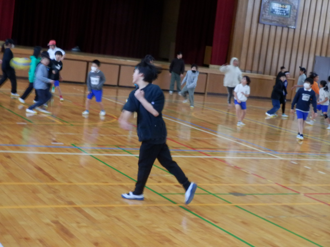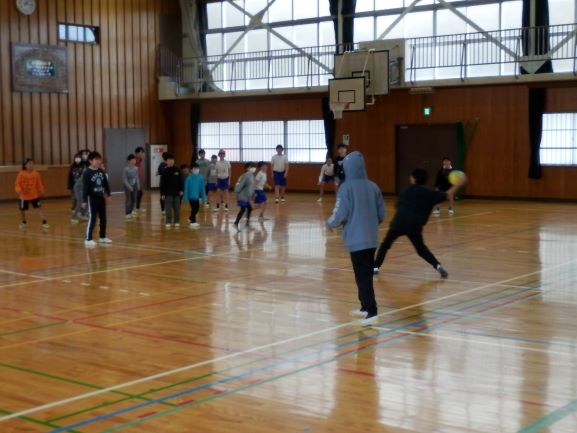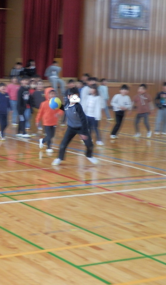 昼休み、ふれあい委員会主催で上学年のドッジボール大会が行われました。広いコートにたくさんの人。複数のボールでプレイしていました。