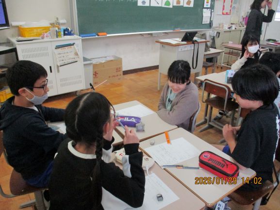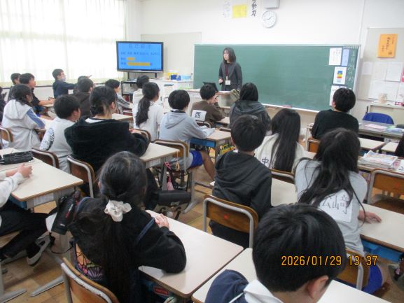 北大路中学校の先生が来てくださり、社会科の出前授業をしていただきました。グループワークの課題を話し合いながら進めていき、楽しみながら学習している姿が見られました。中学校が楽しみですね!