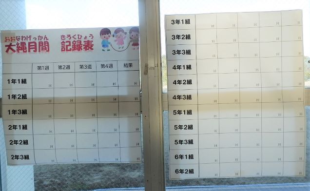 富士見小学校の2月は大縄月間です。昇降口にクラスごとの記録表が貼られました。
