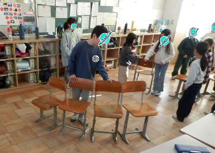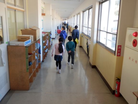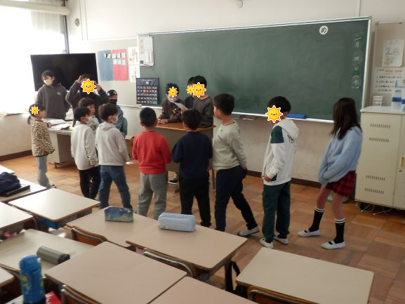 2校時は今年度最後のたてわり活動でした。リーダーが1年生を迎えに行き、班の教室へ連れていきます。