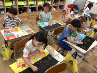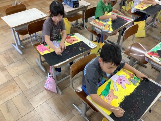 図画工作で、クレパスと割り箸を使って花火を描きました!!様々な色で塗った後、黒でその色を塗りつぶし、割り箸でけずって花火を描く方法です。