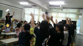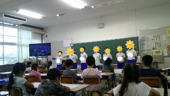 今日から、朝の時間に運動会に向けて応援練習が始まりました。色ごとに6・5年生が下の学年の教室に行き、掛け声や動きを教えていきます。