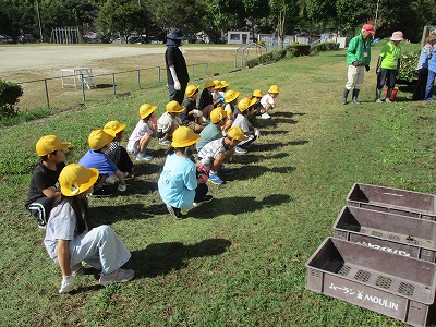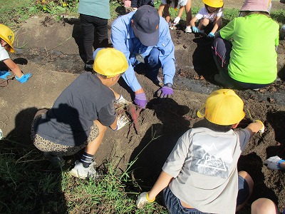 今日は気持ちの良い天気のなか、サツマイモの収穫をしました。ふれあい農園の方々に支援をしていただきました。つるを引っ張るだけでは収穫ができず、周りの土を掘りながら、サツマイモを収穫しました。細いものもあれば太いものもあり、楽しそうに児童たちは取り組んでいました。収穫できたサツマイモの食べ方は何がいいかな?