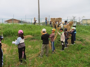 まちづくり協議会の皆様にお世話になり2週間前に稲刈り体験をし、はさがけにして乾燥してもらっていた稲を、今日も、まちづくり協議会の皆様にお世話になり、脱穀体験をしました。