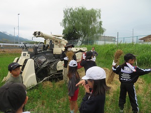 地域の方々がコンバインも用意してくださり、子ども達は順に並んで、乾燥した稲の束をバケツリレーのように手渡しでコンバインまで送りました。