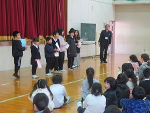 終業式では、各学年代表児童の2学期の思い出や冬休みに頑張りたいことの発表、人権の花運動についてのお話、伊香立推しの子終業式Ver.など盛りだくさんでしたが、皆で集う2学期最後の時間を大切に過ごせました。