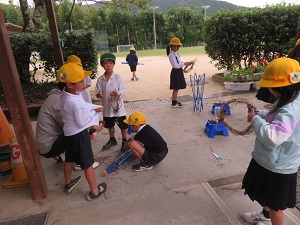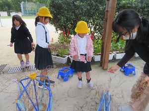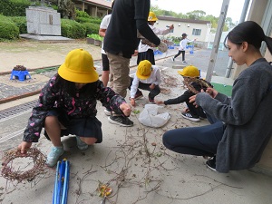 1年生が春から育てたアサガオは、夏休みには沢山の花を咲かせました。秋も深まり花や葉は落ち、蔓だけとなりました。蔓を支柱から外し、リース作りに取り組みました。