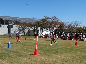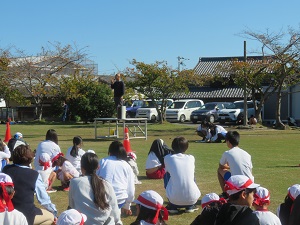 「はじめの会」で、伊香立中学校 上林校長先生が、芝生グランドが完成した当初、当時の自治連合会長様のお声かけで、伊香立学区の子どもたちや地域の皆様が一堂に会して交流する場を持つようになったと、経緯を話してくださいました。