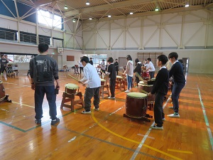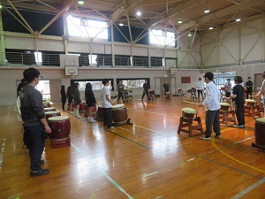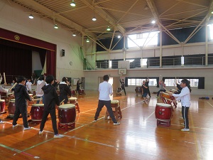 今年は、高校生の団員で、本校の卒業生2名が指導補助に入ってくださっています。当時、小学校6年生で伊香立太鼓を始めた子だちです。