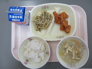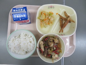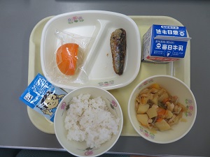 献立:麦ごはん・ふりかけ(わかめ) 牛乳 いわしの揚げびたし 鶏肉と大豆の煮物 いよかんエネルギー たんぱく質 脂質:614kcal 24.1g 19.7g