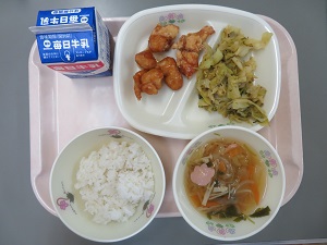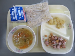 いつもと違って中華麺の日だったので、子どもたちも心が躍るようでした。「厚揚げとひよこ豆のコロコロ揚げ」や「さつまいものマーマレード煮」が甘めのおかずで、大雪の寒い日にはホッとできる献立でした。