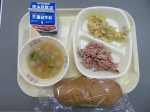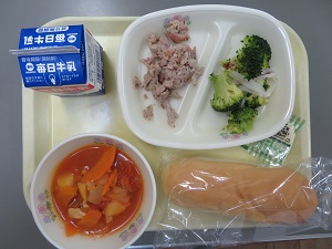 献立:コッペパン 牛乳 豚肉のバジル焼き ブロッコリーのサラダ・マヨネーズ チキンカチャトーラ(鶏肉のトマト煮込み)エネルギー たんぱく質 脂質:615kcal 28.5g 26.6g