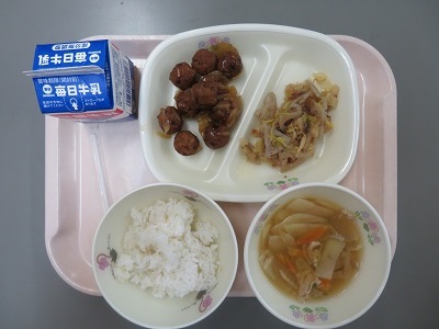 献立:麦ごはん 牛乳 鶏団子の甘酢だれ れんこんのおかかあえ のっぺい汁エネルギー たんぱく質 脂質:541kcal 21.6g 16.4g