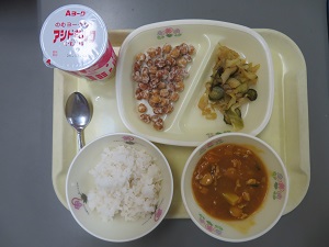 献立:麦ごはん のむヨーグルト 大豆とひよこまめのしゃりしゃり揚げ キャベツの塩昆布あえ 坂本小学校おすすめカレー