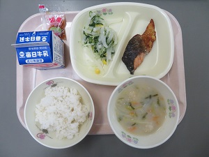 献立:麦ごはん 牛乳 ますの塩麹焼き だいこんと水菜のサラダ・和風ドレッシング 三日のだんご汁エネルギー たんぱく質 脂質:555kcal 24.8g 13.9g