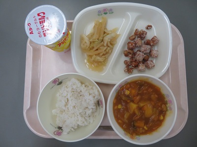 今日の給食は「滋賀の産物」献立でした。あゆの漁獲量が少なく、「もろこのカレー揚げ」に変更になりましたが、もろこも美味しくいただきました。