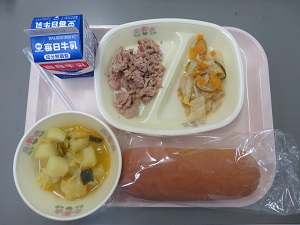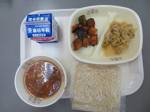 本日の献立は、中華麺、牛乳、大学くかぼちゃ、鶏肉とキャベツのオイスターソース炒いため、マーボースープでした。マーボースープは、新登場メニューでした。中華麺と良く合い、見た目以上の美味しさでした。