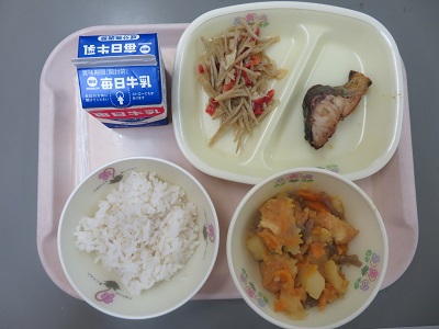 献立:麦ごはん 牛乳 あじの照り焼き ごぼうサラダ 厚揚げの煮物「あじ」は、甘辛の照り焼きだったので、お魚の苦手な人も食べやすかったのではないでしょうか。