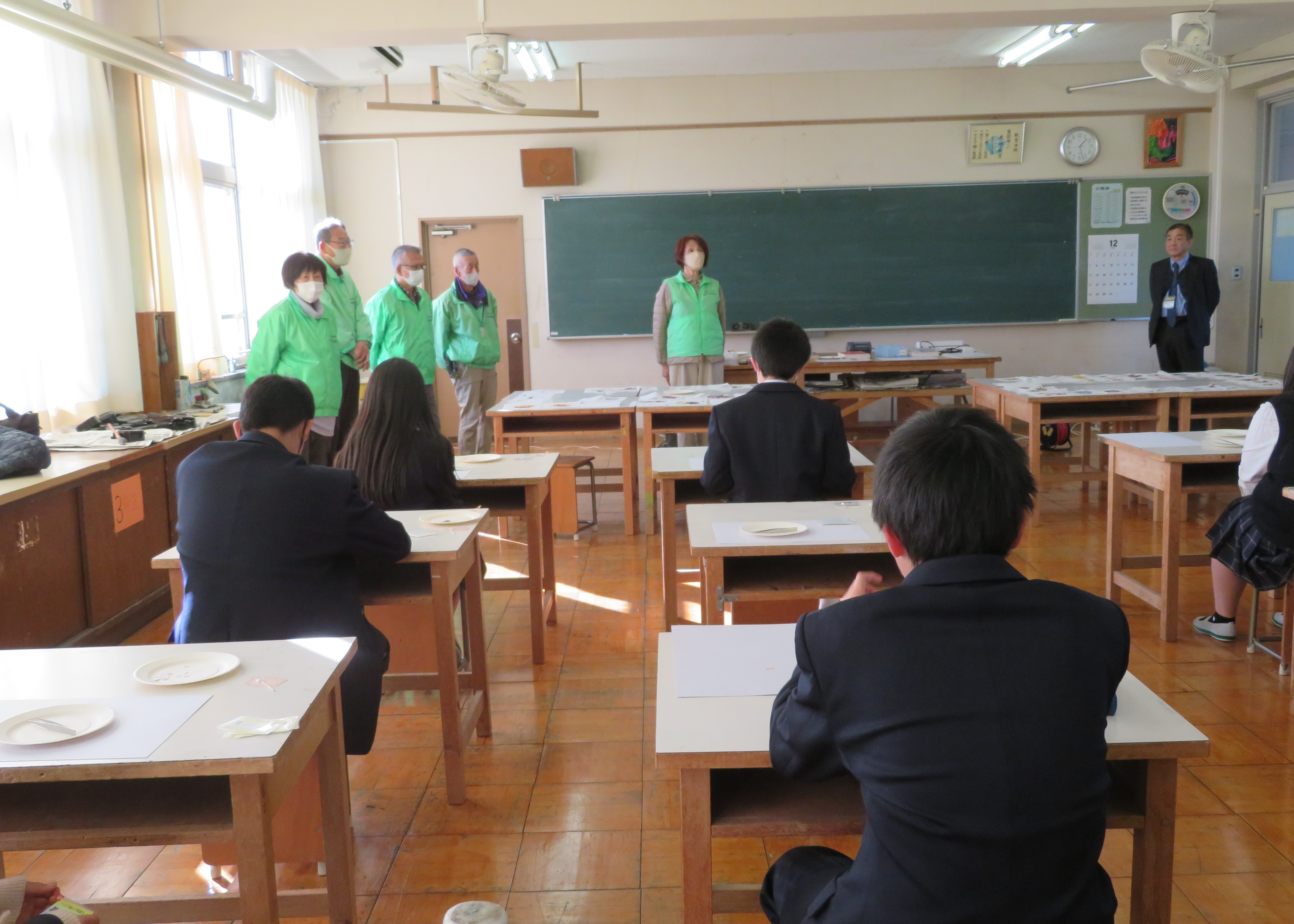 先週(10/14)に伊香中祭(文化の部)が行われました。午前中は、建築板金制作と洋菓子制作の2グループになり、滋賀県職業能力開発協会から来ていただいたマイスターの方々から教えていただいて、ものづくり体験に取り組みました。全員が真剣に制作に取り組んでいる姿が見られました。