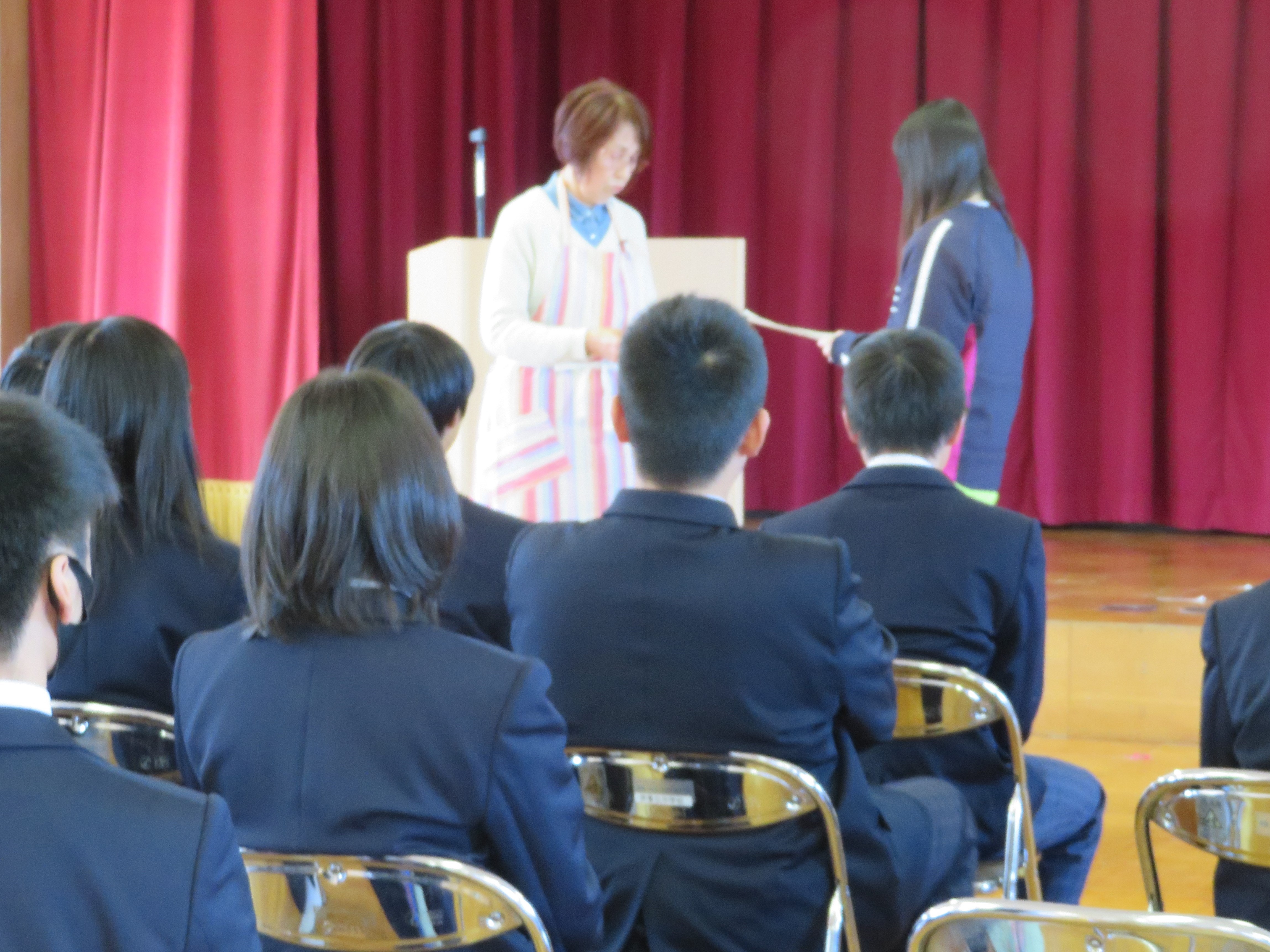 今日の4校時に、大津北警察署少年サポートセンターの方と補導員の方々に来ていただき、「薬物乱用防止教室」を実施しました。薬物の怖さを知り、薬物には絶対に触れないという強い意志を養うことを目的とした学習です。最初に、先生と補導員の方々との劇から始まり、生徒たちは真剣な態度で取り組んでいました。