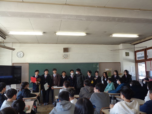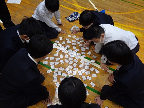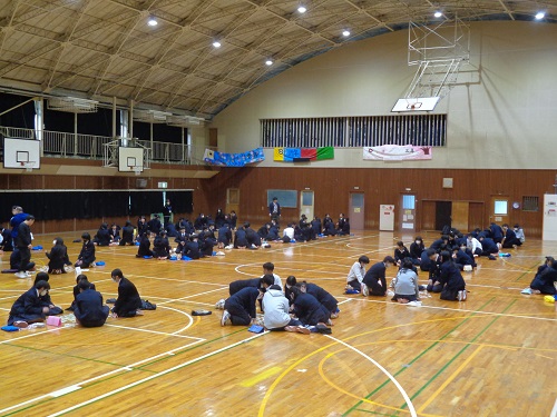 生徒会主催で1,2年生が体育館に集まり、百人一首大会が開催されました。学級対抗と個人戦があり、練習した成果を発揮し、どのグループも熱戦が繰り広げられていました。執行部の生徒の読み上げもとても上手で、滋賀や大津をテーマに詠んだ歌を取り合った時は、歓声も一際大きく響いていました。準備、運営に当たってくれた生徒会の皆さん、大会が盛り上がってよかったですね。最後には、PTAより、全校生徒に百人一首を詠んだメッセージとプレゼントが配られました。3年生には一人ひとりにメッセージカードが入っており、温かいエールを送っていただき感激でした。本当にありがとうございました。