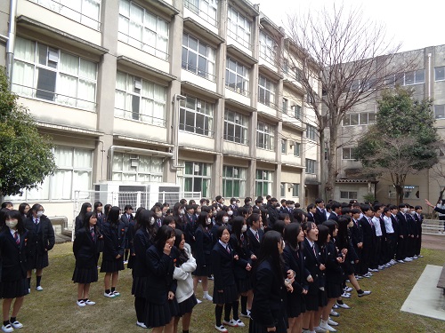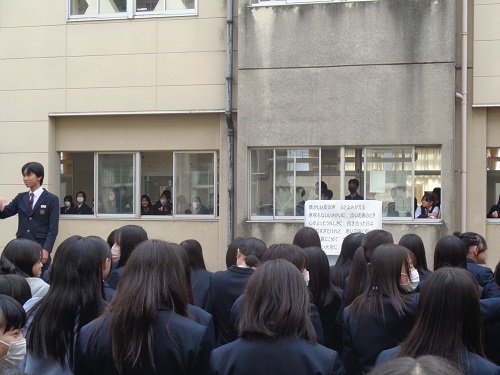 生徒会の企画による「中庭コンサート」が行われました。1,2年生がほぼ全員中庭に集まり、「旅立ちの日に」を合唱しました。校舎いっぱいに響いた歌声に、3年生は窓から顔をのぞかせ、うれしそうな表情を見せてくれました。学年を越えて心が通い合う、温かいひとときとなりました。言葉だけでは伝えきれない思いを、歌声にのせて届けることができた今回の中庭コンサート。石山中学校らしい、やさしさとつながりにあふれた時間となりました。卒業へと歩みを進める3年生の背中を、大きく後押ししてくれたのではないでしょうか。