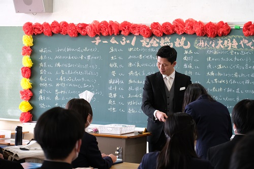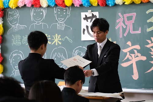 卒業式を終えた後、各教室では担任の先生と過ごす「最後の学級の時間」がありました。教室では、担任の先生から卒業証書が手渡され、一人ひとりに言葉が送られました。