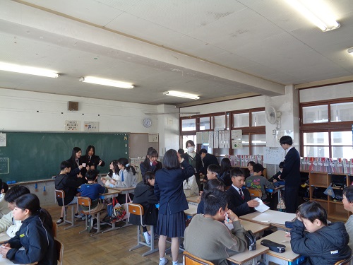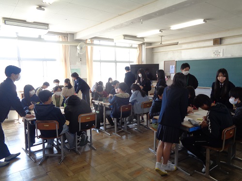今回はボランティアとして、1年生16名、2年生16名が参加しました。6年生の各クラスで班に分かれた小学生の中に中学生が入り、これから始まる中学校生活について小学生から出された質問・不安、決意などを丁寧に聞き取りながら、温かく関わっていました。石山中学校の代表として、落ち着いた態度で堂々と交流に臨み、小学生にとって中学校を身近に感じることのできる時間となりました。