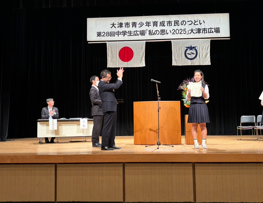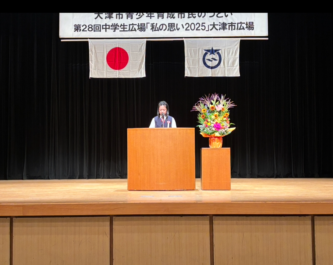 9月20日(土)大津市青少年育成市民のつどい第28回中学生広場 「私の思い2025」大津市広場」が開催され、本校3年生の河野さんが中学生意見発表に出場しました。市内各中学校から応募された作文の中から優秀賞に選ばれた11名の一人として、発表の場に立ちました。河野さんは「私の故郷、滋賀の自然」をテーマに、琵琶湖の美しさや自然の恵みを自らの体験をもとに語り、自分にできることは何かを真剣に見つめ直した思いを力強く伝えました。ふるさとを大切にする気持ちと、未来を担う中学生としてのメッセージが多くの来場者に響いた発表となりました。