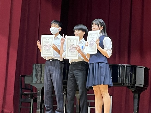 3年2組が「Cantare〜歌よ大地に響け〜」で最優秀賞に輝きました。優秀賞は1年3組「ハートのアンテナ」、2年2組「時を越えて」。どのクラスも気持ちを一つにして歌声を響かせました。マエストロ賞は3年の三和さん・小西さん、2年の大坪さんに贈られました。2025/10/02