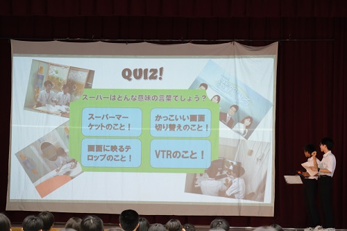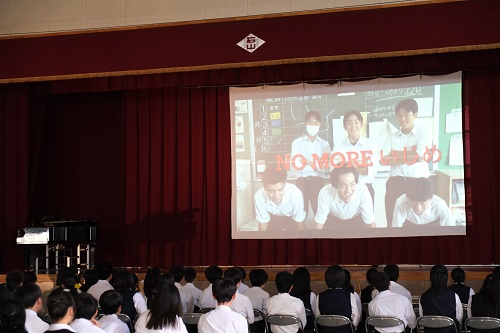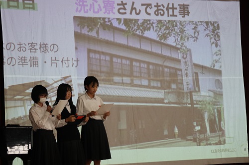 本日、全校生徒が集まり事後発表会を行いました。各グループは、体験をもとに映像やクイズを交えて工夫しながら、仕事の内容や職場の方々の思いを紹介しました。準備を重ねた発表は堂々としており、聴く側と互いに学び合う場となりました。1年生は、働くことの厳しさを知り、そこから仕事のやりがいを感じ取る姿がありました。2年生は、多くの人との関わり通して、自分の生活にどう生かすかを考えていました。3年生は、社会とどう関わっていくのかという問いに向き合い、自分の将来を見据えて考えを深めていました。全校で発表を行うことで、3年生はこれまでの3年間を振り返ることができました。1,2年生にとっては、来年以降の取組への期待や意欲を高める時間となりました。この伝統を、みなさんの力でこれからも大切に受け継いでいきましょう。2025/09/29