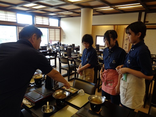 来週に迫った「GO!5!ワーク石山」に向けて、マナー講座を開きました。講師は、昨年に引き続きご指導いただく櫻井悦子先生です。講座では、まず元気なあいさつの基本として、「あいうえお」の口の形を意識するトレーニングから始まりました。その後、言葉に抑揚やタイミングをつけ、動作も加えていくと、回を重ねるごとに生徒たちの声や姿勢がどんどん良くなっていきました。最後に先生から「やる気は心の中にあって見えないので、声や態度、言葉に表してください」とエールをいただきました。たくさんの場面で櫻井先生から褒めてもらい、その成果を早速、今日の授業のあいさつに活かしていました。大事なポイント「ありがとうございました」「お手伝いします」をたくさん使うことを忘れずに!2025/08/27