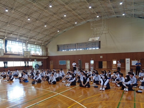 式の始めには、夏の大会の結果を各部活動のキャプテンが報告し、応援してくれた人へ感謝を述べました。校長からは、大会での生徒の姿から、最後まであきらめずに挑戦したこと、仲間と積み重ねた時間は、必ず次のステップにつながるということを話しました。また、「戦後80年」という長い年月の中に、つながれてきた命があること、今ここで仲間と出会う「奇跡」にふれ、一人ひとりが安心して自分らしく過ごせる二学期にしようと伝えました。続いて、生徒指導主事の今井先生からは、行事を通して仲間力を高めるために必要なのは「楽しむ力」「笑う力」であり、キーワードとして「楽笑力」(らくしょうりょく)と表現されました。子どもたちの心を明るく前向きにしてくれるお話でした。2025/07/26