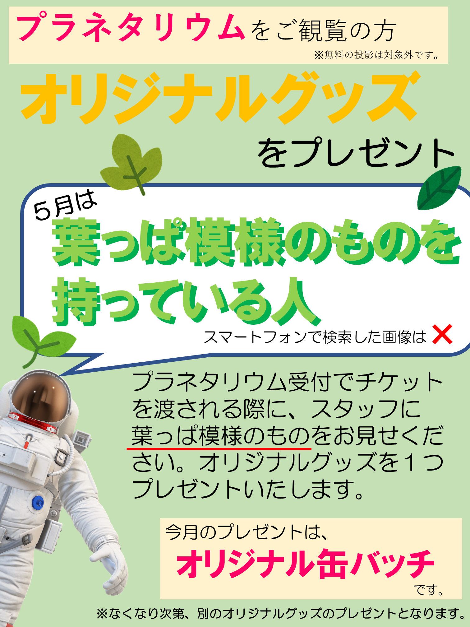 5月のスケジュール 葉っぱの形や模様の物をお持ちの方に、科学館特製グッズをプレゼント♪(*印の投影は除く) |