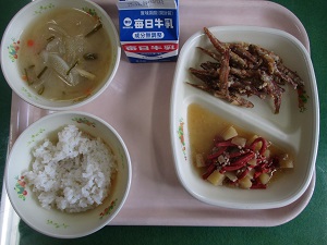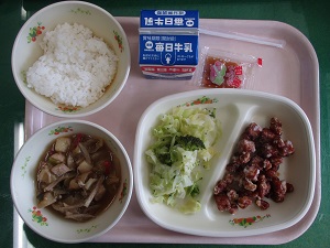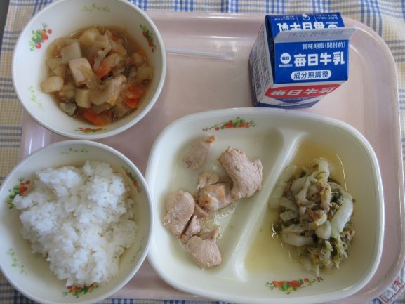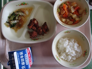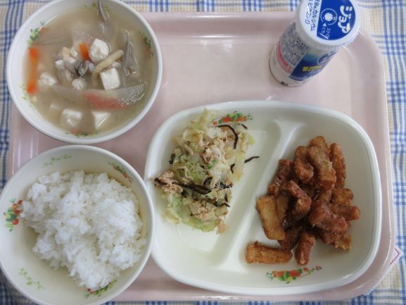 【滋賀の産物を食べようデー】白ごはん、牛乳、厚揚げと大豆の揚げがらめ、ブロッコリーのサラダ・和風ドレッシング、かしわのじゅんじゅん