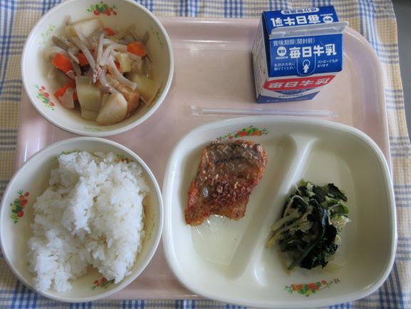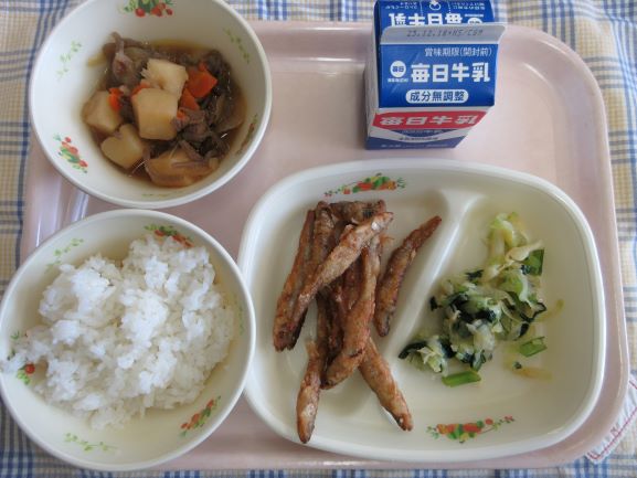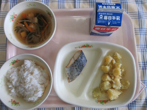 今が旬のさつまいものおかずがつきました。本校では畑で育て収穫し、みんなで焼き芋をいただくという体験学習があり、さつまいもはなじみ深い食材です。