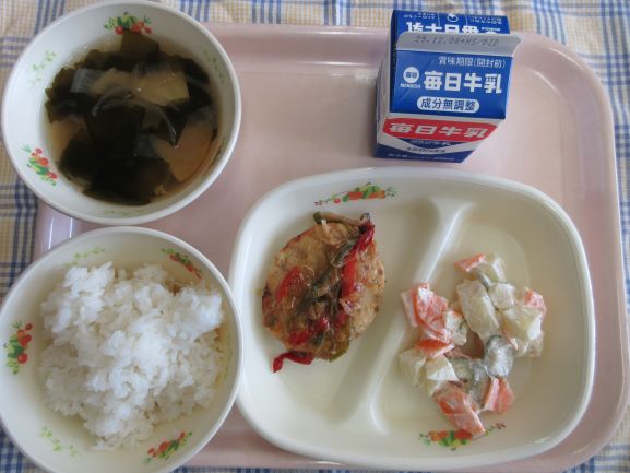昨年度中学生の方が応募してくださった豆腐ハンバーグが給食用にアレンジされて登場しました。ハンバーグに季節にぴったりのきのこやピーマンなど野菜のあんがかかっています。和風の味付けでご飯に合います。