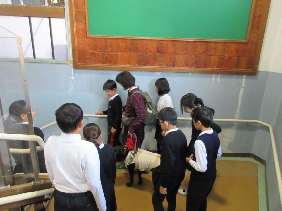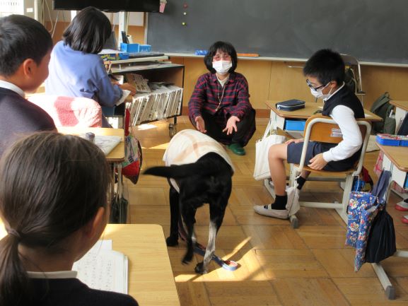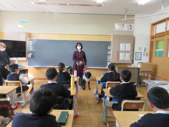 地域にお住まいの前田様にお越しいただき、4年生が出前授業を受けました。盲導犬ペリーさんがハーネスを着けているときは「お仕事中」と理解し、大変賢くサポートしてくれていること、ハーネスを外すと「仕事ではない」ので、普通の飼い犬のように遊んだりリラックスしたりしていること、白杖を持っている方へのサポートの仕方など、前田様のご経験を交えながらユーモアたっぷりに授業をしてくださいました。帰りには子どもたちが交代で「何かお手伝いすることはありますか?」と声かけし、エスコートの仕方を体験しました。みんなの理解がどんどん進んで、「障がい」など感じなくてよい社会になっていくとよいと思いました。前田様、よい授業をしていただきありがとうございました。