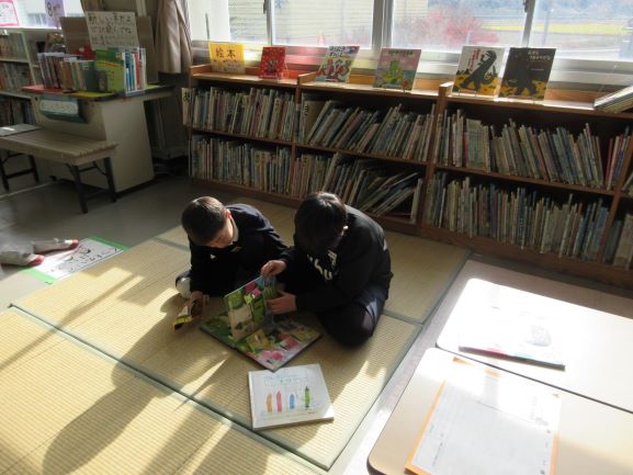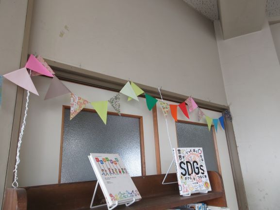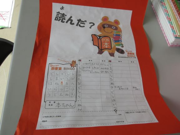 菜の花会「本読みボランティア部」の方たちの発案で、「図書室ビンゴ」が開催されています。低学年は8文字、高学年は24文字のことばをつくり、その頭文字から始まる本を選んで読んでいく、という取り組みです。図書室を訪れる子どもたちが少しずつ増えてきており、友だちと仲良く本を見る姿も見られています。司書の先生は12月の雰囲気を出そうと手作りの飾りを図書室に掲示してくださっています。本を手にとっていつもと違う世界に入っていく体験が広がっていくといいなと思います。